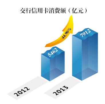 2013年,交行信用卡持续开展“最红星期五”品牌经营,加强对优质商户精细化管理,推出“超级最红星期五”大型超市、加油优惠活动。完善消费金融产品,实现分期金额不受单笔交易金额限制功能。报告期内,交行信用卡交易额有较大幅度的增长(见图三)。
