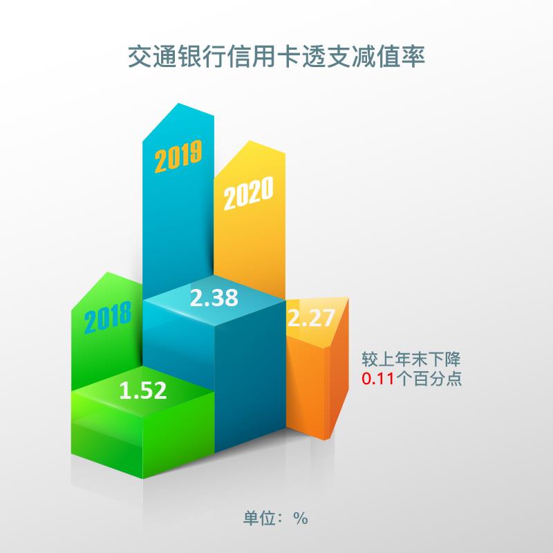 截至2020年末,交通银行信用卡透支不良率为2.27%,较上年末下降0.11%