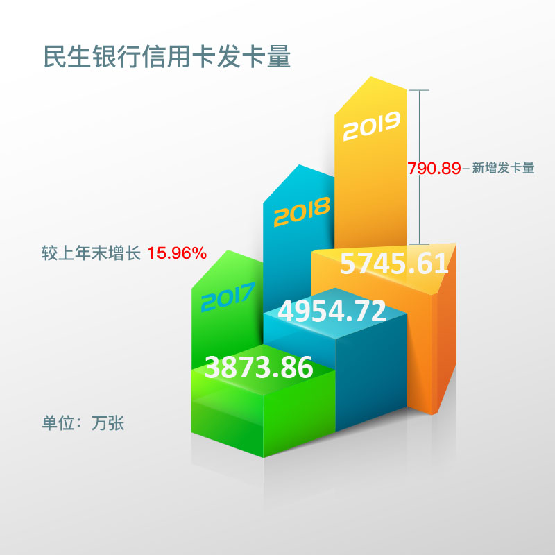 截至报告期末,民生银行信用卡累计发卡5,745.61万张,报告期内新增发卡790.89万张,较上年末增长15.96%。截至2018年末民生银行信用卡累计发卡4,954.72万张,截至2017年末民生银行信用卡累计发卡3,873.86万张。