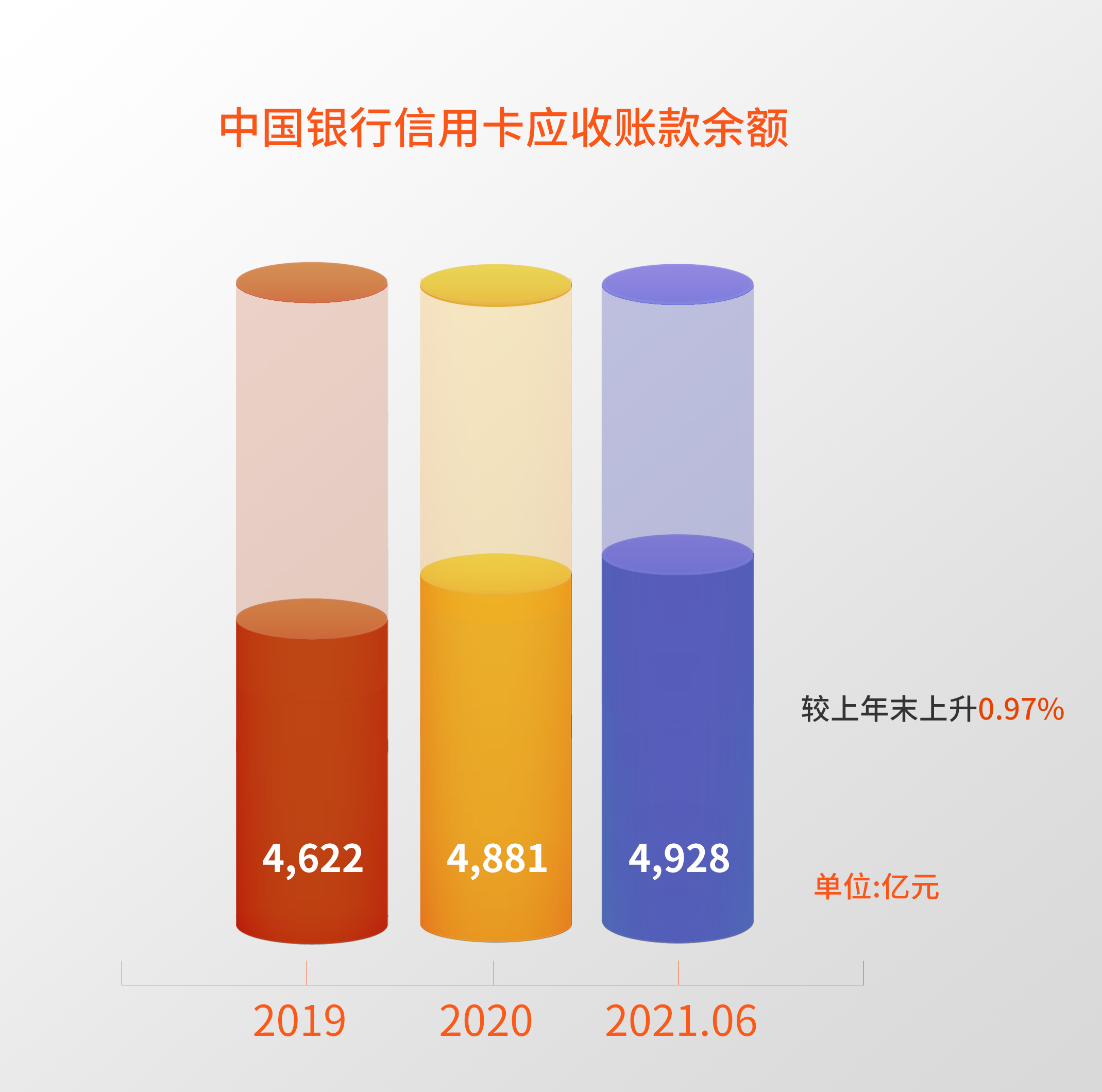 截至2021年6月末,中国银行信用卡应收账款余额4,928.24亿元,较上年末增长0.97%。
