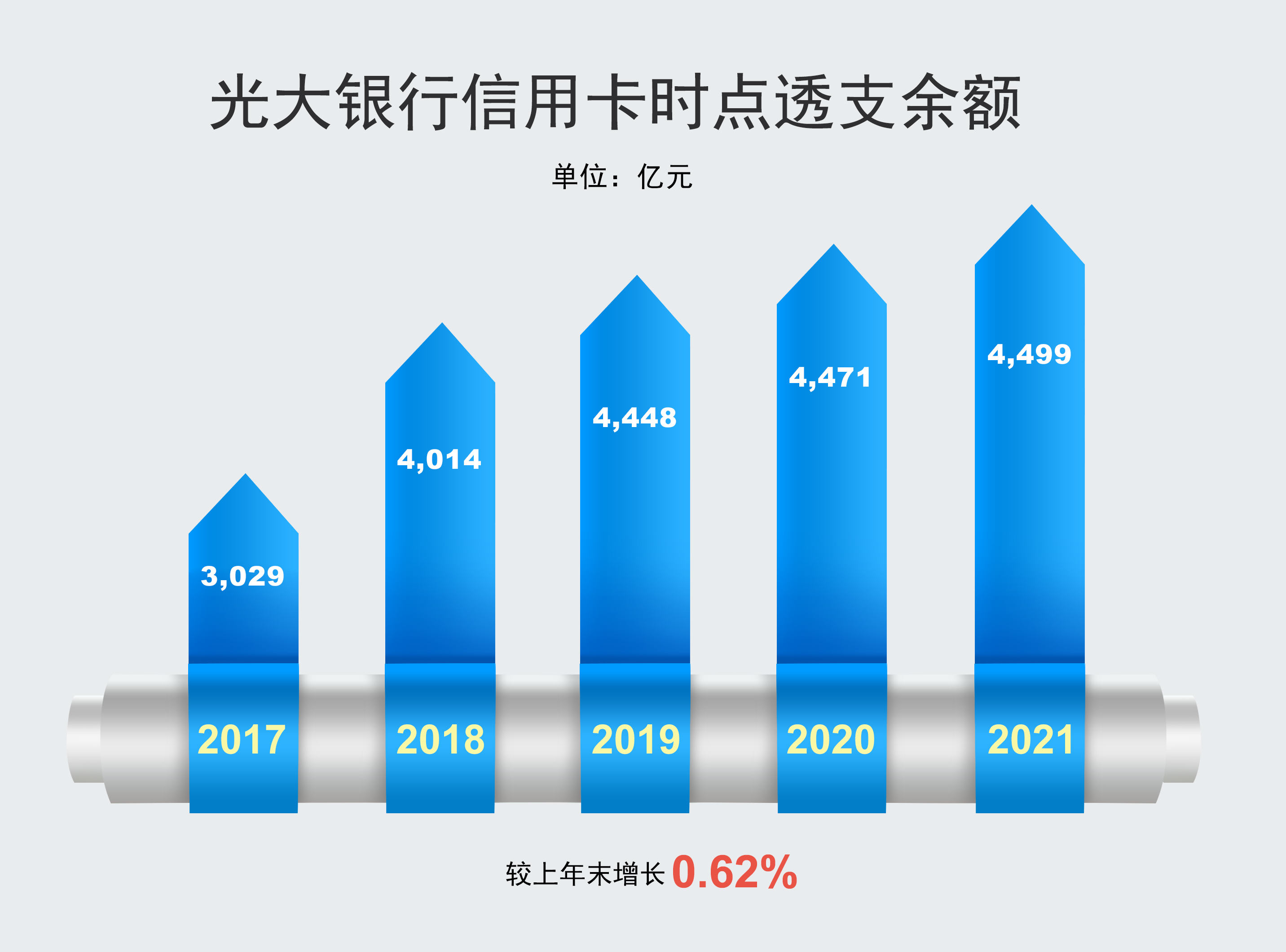 截至2021年末,光大银行信用卡时点透支余额4,498.72亿元,较上年末增长0.62%。