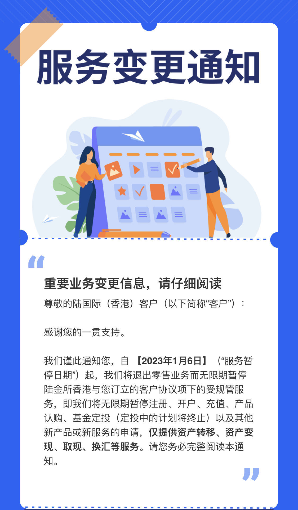 12月5日,陆金所香港官方App日前发布服务变更通知称,自明年1月6日起,公司将退出零售业务,无限期暂停注册、开户、充值、产品认购、基金定投以及其他新产品或新服务的申请,仅提供资产转移、资产变现、取现、换汇等服务。通知同时提示客户完整阅读通知,并尽快进行资产转移或自行赎回资产。