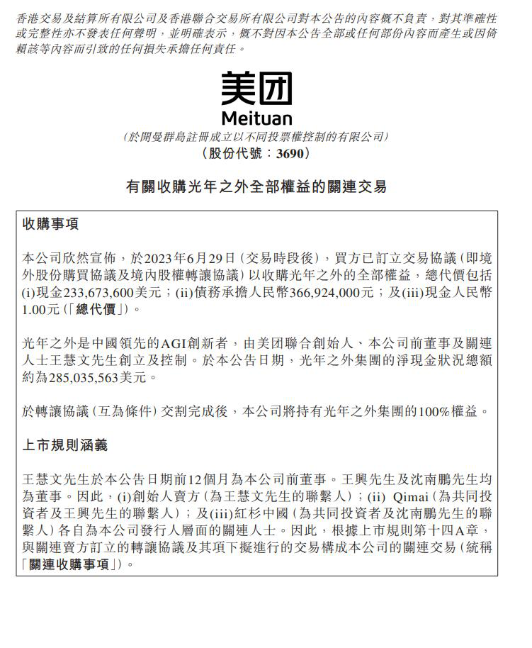6月29日,美团在香港联交所发布公告,称已完成北京光年之外科技有限公司境内外主体100%股权的收购,收购价约为20.65亿人民币。