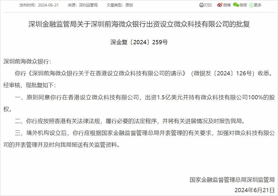 6月21日,国家金融监督管理总局深圳监管局发布批复,原则同意微众银行在香港设立微众科技有限公司(下称“微众科技”),出资1.5亿美元、持有微众科技100%的股权。
