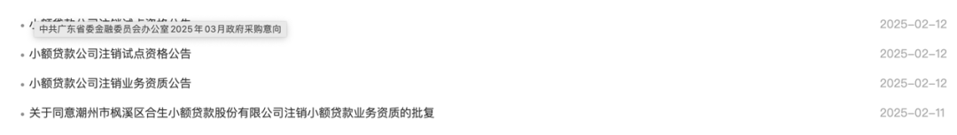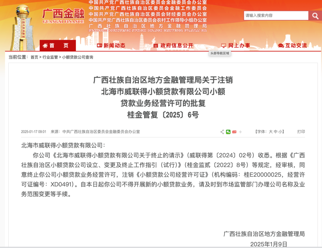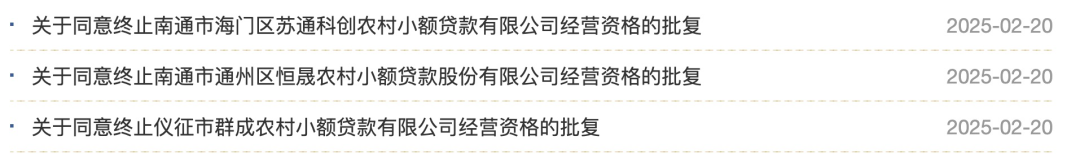 进入2025年,小贷公司退出潮还在持续。作者不完全统计发现,2025年开年至今,江苏、内蒙古、四川、广东、广西等五省金融办已经取消了38家小贷公司的试点经营资格。2月20日,江苏省金融办发布了三家小贷公司终止经营的批复,同意终止南通市海门区苏通科创农村小额贷款有限公司(下称“南通苏通科创小贷”)、南通市通州区恒晟农村小额贷款股份有限公司(下称“南通恒晟小贷”)、仪征市群成农村小额贷款有限公司(下称“仪征群成小贷”)的经营资格。 1月16日,江苏金融办还发布了《关于同意终止南通市海门区大岛农村小额贷款有限公司经营资格的批复》。这意味着,开年来仅江苏一地就有4家小贷公司退出经营。而在2月18日,内蒙古金融办也发布了《关于同意取消10家小额贷款公司经营资格的公告》,取消赤峰市元宝山区永富小额贷款有限责任公司、赤峰市元宝山区融昌小额贷款有限责任公司、锡林浩特市瑞恒小额贷款有限责任公司、伊金霍洛旗圣圆小额贷款有限责任公司、满洲里市林发小额贷款有限责任公司、满洲里市创大小额贷款有限公司、多伦县信邦小额贷款有限责任公司、阿拉善左旗国资小额贷款有限公司、通辽市奈曼旗旺达小额贷款有限公司、通辽市开鲁县晟信小额贷款有限公司10家小额贷款公司经营资格,不得继续从事或者变相从事小额贷款经营业务。 同样,1月10日,内蒙古金融办发布消息,呼和浩特市兴银小额贷款有限责任公司、呼和浩特市兴光小额贷款有限责任公司、呼和浩特市济源小额贷款股份有限公司、呼和浩特市银都小额贷款有限责任公司、呼和浩特市大众小额贷款有限公司、呼和浩特市金蒙小额贷款有限公司、呼和浩特市义特格勒小额贷款有限责任公司、呼和浩特市祥泰小额贷款有限责任公司、呼和浩特市银友小额贷款有限公司、呼和浩特市中网福通小额贷款股份有限公司、呼和浩特市利得小额贷款有限责任公司、呼和浩特市金川开发区金汇小额贷款有限责任公司、呼和浩特市裕景天小额贷款有限责任公司、清水河县金百山小额贷款有限责任公司、包头市利仁小额贷款股份有限公司、包头市汇金小额贷款有限责任公司等16家小额贷款公司符合“失联、空壳”情形,且已由各盟市完成为期30日的名单公示工作,公示期内未收到公示主体陈述、申辩意见。内蒙古金融办同意取消16家小额贷款公司试点资格,要求不得继续从事或者变相从事小额贷款经营业务。取消试点资格的小额贷款公司应当依法依规完成公司名称及经营范围的变更登记,名称和经营范围中不得使用“小额贷款”“小贷”“贷”字样。变更后,公司依法继续承担相应的债权债务及相关法律责任。也就是说,开年来内蒙古金融办已经取消了26家小贷公司的试点资格。无独有偶,2月17日,四川金融办发布公告,同意广元市旺苍县佳铭小额贷款有限公司退出小额贷款行业。 四川金融办表示,小额贷款公司退出小额贷款行业后,公司不得继续经营小额贷款业务,注册名称和经营范围中不得使用“小额贷款”字样,营业场所等不得使用与小额贷款有关的标识。同样,今年1月16日和2月12日,广东金融办发布六则公告,同意潮州市潮安区融信小额贷款股份有限公司、韶关市曲江区宝银小额贷款有限公司等6家小贷公司注销小贷业务试点资格。 而在1月9日,广西金融办也发布了《关于注销北海市威联得小额贷款有限公司小额贷款业务经营许可的批复》,同意终止小额贷款业务经营许可,注销《小额贷款公司经营许可证》。从行业来看,伴随小贷行业监管趋严、竞争加剧等问题,近年来小贷公司持续出清。 监管方面,2025年1月国家金融监督管理总局发布的《小额贷款公司监督管理暂行办法》,进一步细化并规范小额贷款公司经营行为,明确了小额贷款公司业务范围及贷款集中度比例要求,对小贷公司的各类违规行为进行了严格规定。其中,严禁小额贷款公司违规开展“通道”业务,不得出租、出借牌照,为无放贷业务资质的主体提供放贷“通道”等等。 数据上看,截至2024年12月末,全国共有小额贷款公司5257家,贷款余额7533亿元。而在2022年末,全国共有小额贷款公司5958家,小额贷款公司贷款余额9086亿元。也就是说,两年时间里,小贷公司减少701家,贷款余额减少1553亿元。