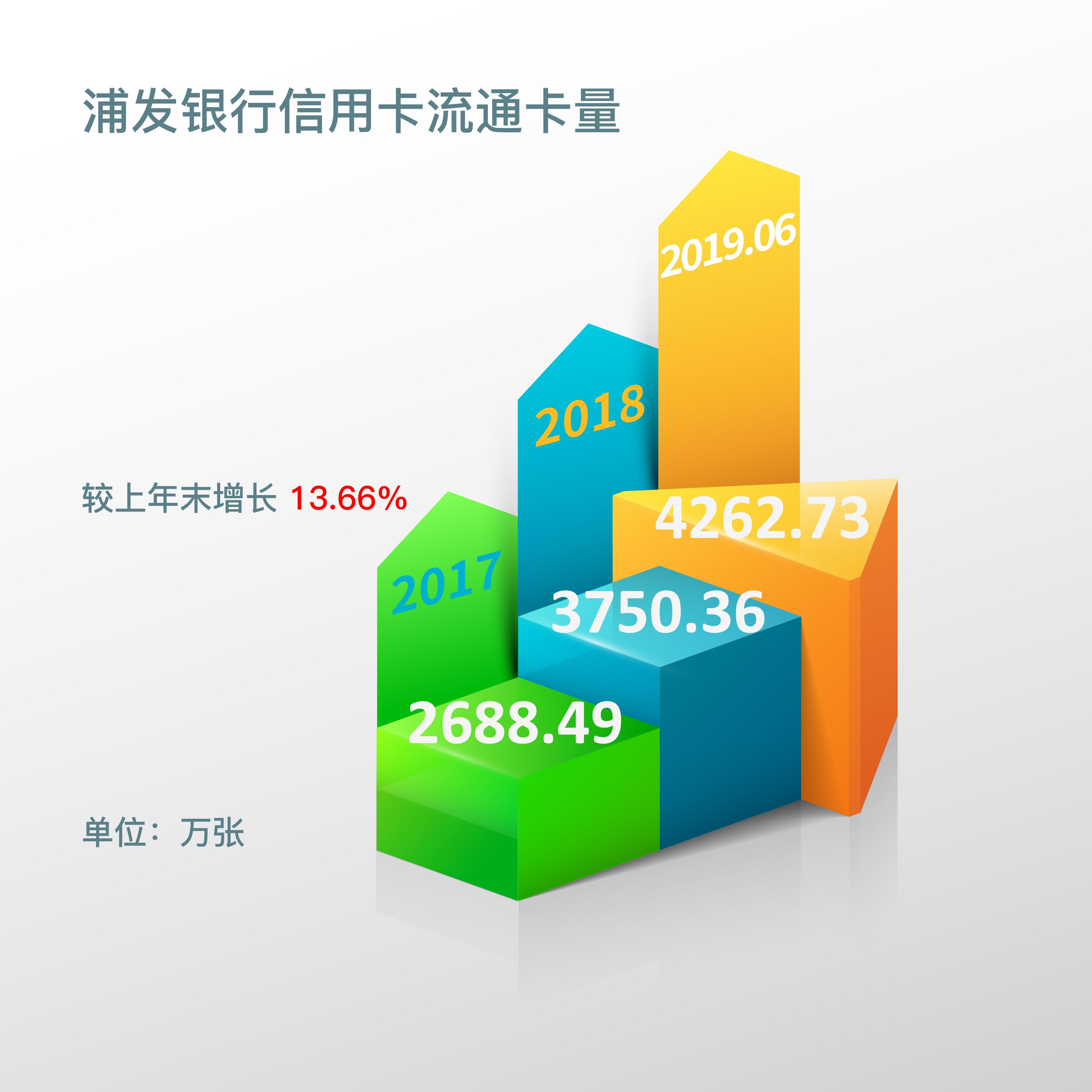 截至报告期末,浦发银行信用卡流通卡量4,262.73万张,较上年末增长 13.66%,新增流通卡量512.37万张。据往年年报显示,截至2018年末流通卡量3,750.36万张,截至2017年末流通卡量2,688.49万张。