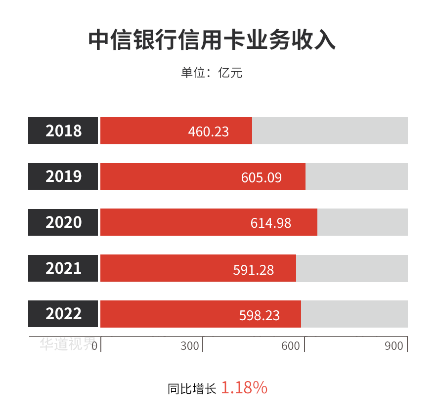 2022年,中信银行实现信用卡业务收入598.23亿元,同比增长1.18%;