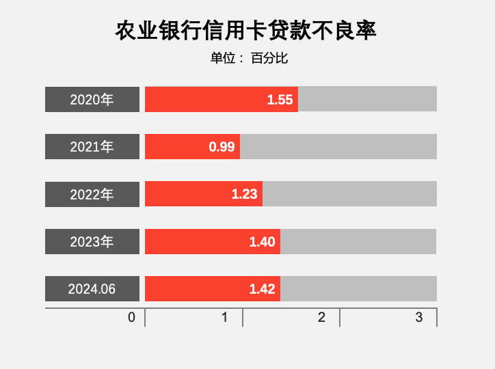 截至 2024年6月末,农业银行信用卡不良贷款率1.42%。