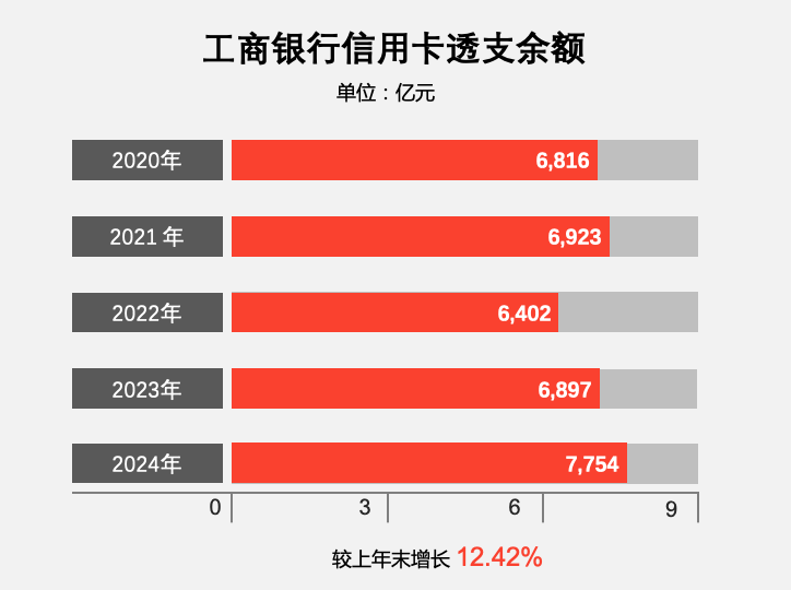 截至2024年末,工商银行信用卡透支余额7,753.64 亿元,较上年增长12.42%;