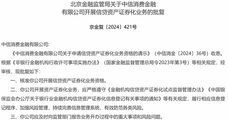 截至目前,31家持牌消金中,已有19家获得了发行ABS的资格,有13家完成ABS发行。最新获批ABS发行资格的消息为2024年7月,中信消费金融获取国家金融监督管理总局北京监管局许可: