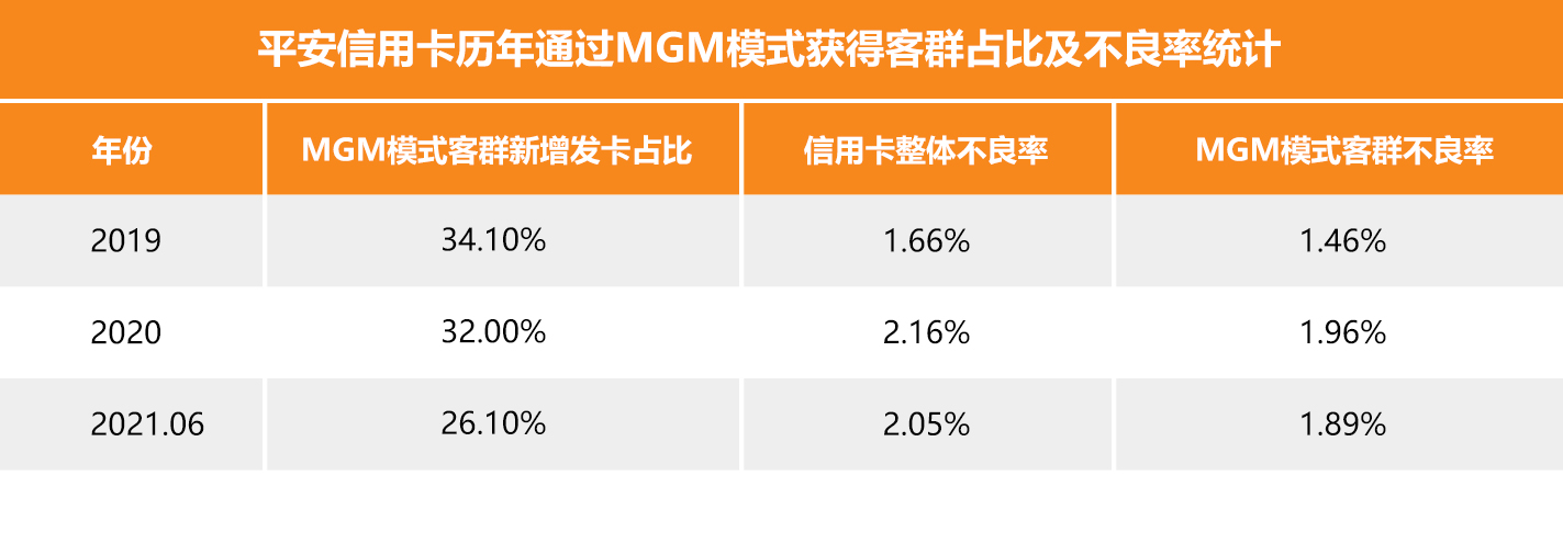 2019年,平安信用卡通过MGM模式引流的客户在当年信用卡新增发卡中占比达34%,该模式为平安信用卡提供了一个新的优质的获客渠道。此外,该模式带来的用户质量相比之前也有所提高。据年报数据显示,平安信用卡通过 MGM 模式获得的用户所产生的不良率连续三年低于信用卡整体不良率。