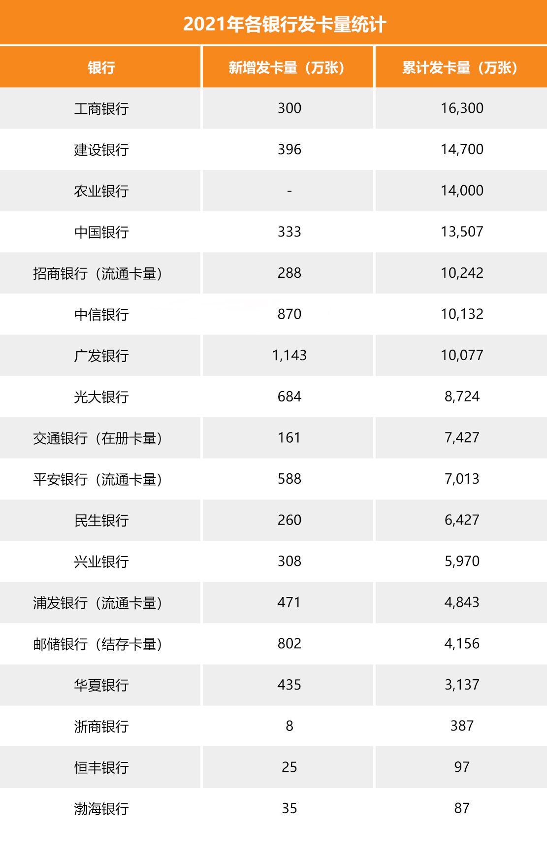 同《2021年支付体系运行总体情况》所体现的信用卡和借贷合一卡发卡速度减缓同步,2021年各大银行信用卡新增发卡均有所放缓。期中,发卡量最高的为广发银行新增发卡1,143万张,广发银行也是唯一一家新增发卡量超过1,000万张的银行;其次为中信银行新增发卡870万张,邮储银行以新增发卡802万张排名第三。
