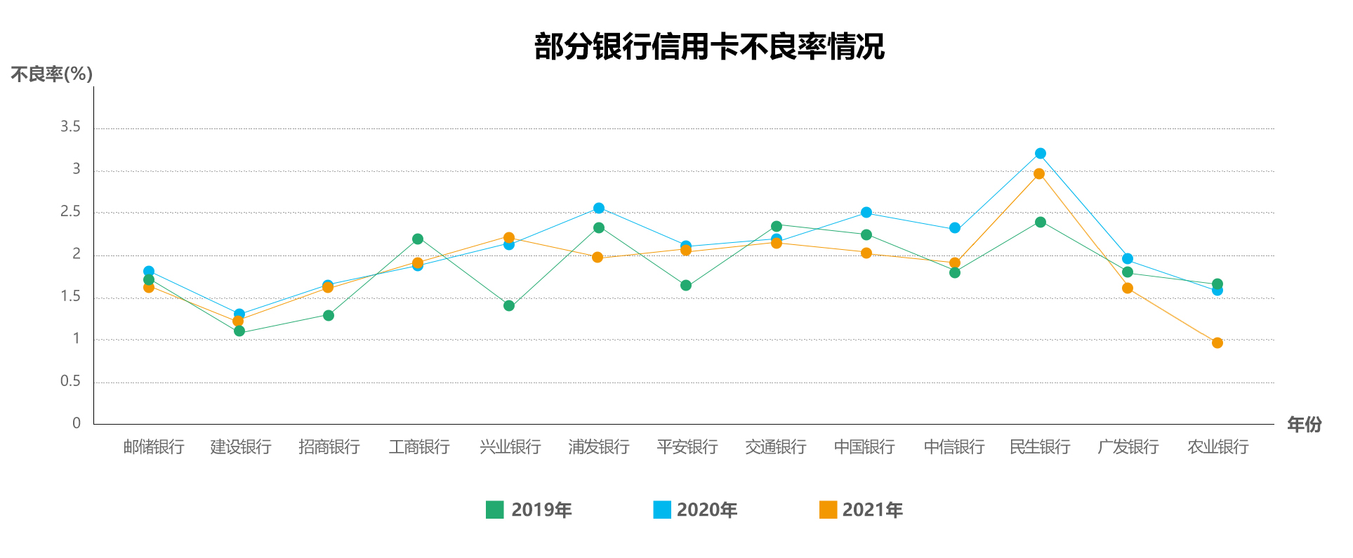 此外,2021年信用卡不良率最低的为农业银行,信用卡不良率低至0.99%,同时也是农业银行近10年来信用卡不良率最低水平,其次为建设银行信用卡不良率为1.33%。