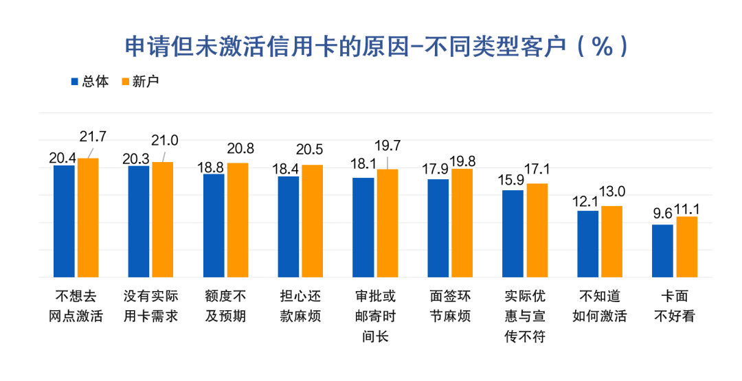 在激活环节,新户对于各方面因素的关注度、敏感度显著高于整体用户,这表明持卡人对于用卡体验、服务水平的要求越来越高。“不想去网点激活”是降低激活意愿的首要因素,而视频面签的应用能够显著改善这一痛点。