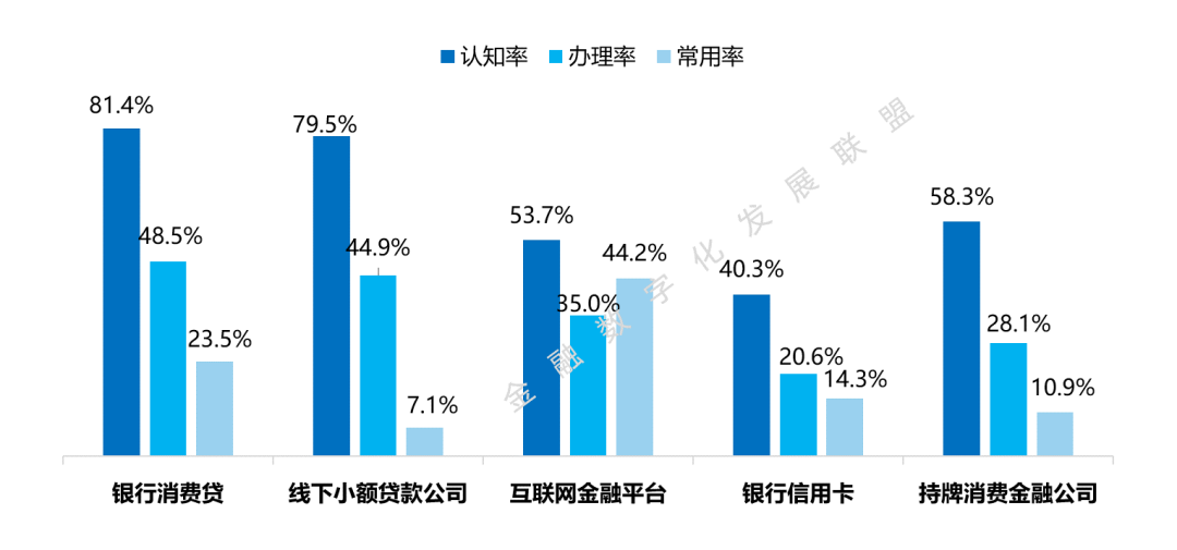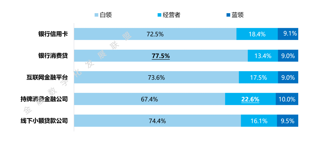 在城市层级维度,信用卡作为信用支付产品,在三线及以下城市的用户占比为35.5%,而现金贷产品和专项消费分期产品这一指标分别为24.8%、23.0%。信用卡专项消费分期产品中,三线及以下城市用户占比30.0%,银行消费贷业务中这一比例为21%。信用卡现金贷业务中,三线及以下城市用户占比为19.5%,依旧高于银行消费贷业务0.3个百分点。在用户认知维度,在信用支付产品上,银行信用卡的认知率与办理率均超80%,常用率为68.7%%,各项比例均显著高于其他机构。但对于现金贷、专项消费分期产品,信用卡的认知率仅为40.3%和31.6%,较银行消费贷分别低41.1和21.7个百分点;办理率分别为20.6%和13.7%,较银行消费贷分别低27.9和10.5个百分点;常用率分别为14.3%和26.1%,较银行消费贷分别低9.2和1.5个百分点。此外,值得关注的是,在通过信用卡办理专项消费分期的用户中,18-25岁客群占比高出消费贷6个百分点,一定程度上表明信用卡得到年轻客群的认可。图5:各类型机构现金贷产品的用户认知率、办理率与常用率图6:各类型专项消费分期产品的用户认知率、办理率与常用率在盈利能力维度,信用卡分期用户的平均年化利率为9.07%;在现金贷业务中,信用卡平均年化利率为7.45%,银行消费贷则为6.37%;在专项消费分期业务中,两者基本一致。信用卡业务的收入来源包括利息与非利息收入。根据上市银行年报中公开的信息,我国上市银行零售业务收益率集中在5%-6%,信用卡的收益率在零售业务中具有显著优势。在非利息收入方面,日常交易所带来的回佣收入可以大体弥补运营成本,在深化客户经营的趋势下,增值服务费、年费等成为银行新的收入增长点,且通常贡献非利息收入的用户资质相对更优,风险较小,业务盈利更为稳健。以上市银行为样本进行统计,2022年,国有大行零售业务收入及利润占全行的比重平均值分别为50%、46%,股份行为44%、36%,城商行仅为24%、27%,农商行为38%、42%,几乎都在50%以下,这表明我国银行零售转型的进程仍在继续,信用卡在提升零售业务收入与利润贡献方面具有重要意义。在用户体验维度,整体满意度上,银行信用卡客户为80.0%,较银行消费贷高出2.3个百分点;在场景丰富度的评价中,信用卡同样居于首位;在用户净推荐值表现上,信用卡为42.0%,银行消费贷则为40.3%。此外,相比非银机构,调研发现,偏好使用信用卡的用户比例(52.9%)较偏好使用互联网金融平台或持牌消费金融公司类信用卡的用户(32.1%)高21个百分点,这说明以信用卡为抓手,实现非银机构消费信贷用户的转化具有现实基础。在获客成本维度,信用卡线上、线下的获客成本约290元、234元,而专项消费金融产品线上、线下的获客成本则约328元、268元,银行信用卡线上、线下获客成本均低于专项消费金融产品。在零售融合经营维度,就办理过银行多个产品的用户来看,60%以上的用户都是在使用了该机构的信用卡之后,又去办理了该机构的现金贷或专项分期产品。当信用卡提供的现金贷的额度或期限无法满足需求时,80.4%的受访用户表示愿意申请发卡行其他现金贷产品。从职业分布方面,信用卡用户中经营者的占比高出银行消费贷5个百分点,而白领的占比则较银行消费贷低5个百分点,同时调研发现,对于办理过现金贷产品的经营者来说,超过半数的经营者出于申请繁琐、材料多、门槛高等原因不愿意申请小微企业贷,这表明如果银行能通过信用卡助力小微业务简化流程、改善体验,则有希望同步提升小微业务的发展空间。图12:不同类型机构用户职业分布-消费金融用户整体信用支付产品是消费金融机构实现客户引入的排头兵。以信用卡、类信用卡为代表的信用支付产品,具有免息期,同时凭借支付功能高频嵌入各类生活场景,用户基数广泛,产品理念容易被接受。因此,对于银行来说,信用卡是引入客户、特别是具有现实或潜在消费信贷资金需求的客户,并实现成长培养的有力抓手。针对银行来看,信用卡相比消费贷业务,其用户中三线及以下城市、经营者等下沉客群的占比明显更高。我国消费金融行业在经历了高速发展后,已步入相对成熟的规范发展阶段,市场竞争加剧,一线城市成熟度较高,各类机构均在探寻下沉市场发展空间。银行消费贷业务目前更聚焦于传统优质客户,如一、二线城市、白领客群,相比而言,信用卡是银行与其他机构抢夺下沉市场的有效载体。信用卡与消费贷的产品功能存在部分重合,不同银行对于两类业务的定位和经营战略也存在差异。2022年7月信用卡新规发布,对于现金分期业务,明确要求不得超过5万、2年,此项规定在一定程度上削弱了信用卡业务现金借贷产品的盈利贡献,引发部分银行关于信用卡和消费贷业务关系的思考。调研发现,66.2%现金贷用户的授信额度不超过5万、97.1%不超过24期。对于符合监管要求的现金类业务以及专项消费分期业务,如通过信用卡开展,好处在于用户侧的体验更佳,无需重复提交申请材料,同时前期获客成本较低,往期用卡数据的沉淀也为银行主动发现借贷需求、进行专项营销促动提供了基础。因此,以信用卡业务作为消费金融服务的主入口可能是更优选择,对于信用卡业务无法满足的需求,可以进一步引流至消费贷业务或是其他零售产品,但此种经营思路需要组织架构提供保障。从目前行业情况来看,多数银行同时设立信用卡部与消贷部门,在这种组织架构下,内部协同效率难免