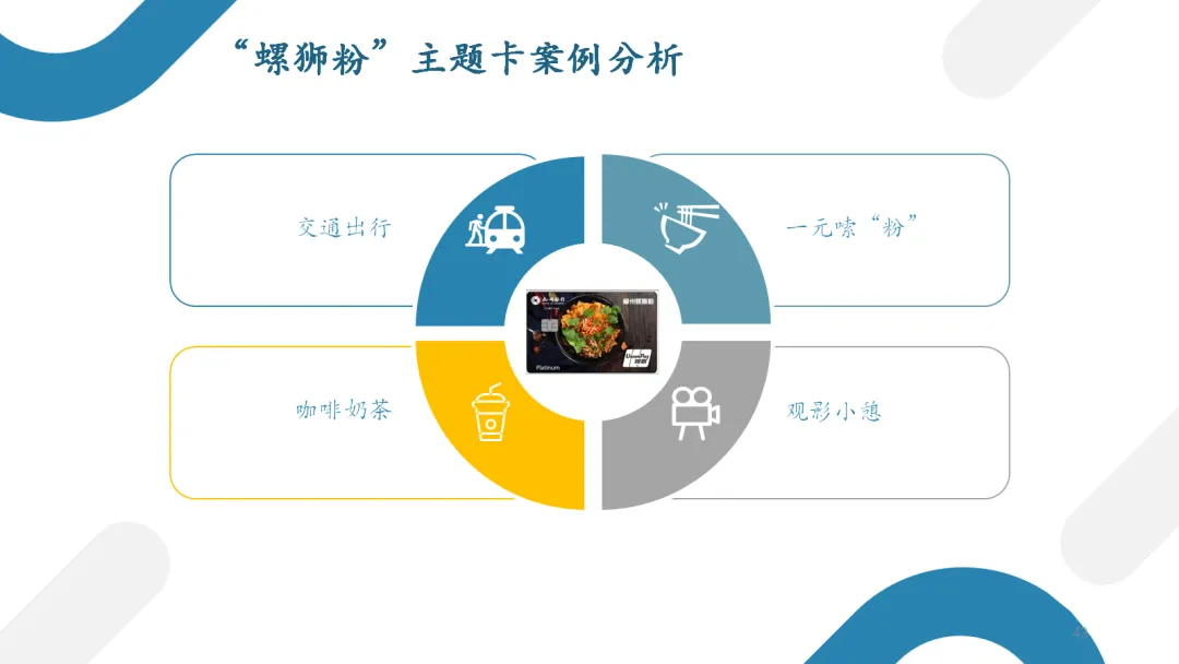 前几年为某城商行策划一款“嗦粉”主题信用卡产品时,是以嗦粉消费为主体,在吸引喜爱消费螺狮粉的客群主动办卡和用卡的同时,考虑到这一主题消费还可以带动其它潜在消费,为此还为该卡设计了围绕主题消费相关的在出行、休闲、娱乐等方面的权益,形成一个针对该卡目标客群在日常休闲生活方面构建起来的多元消费场景生态圈,从几个角度围绕主题权益带动用户办卡和用卡。