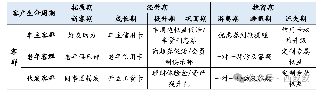 如下表所示,将银行客户生命周期与客群属性结合之后,即可得出不同客群可能感兴趣的产品或服务。