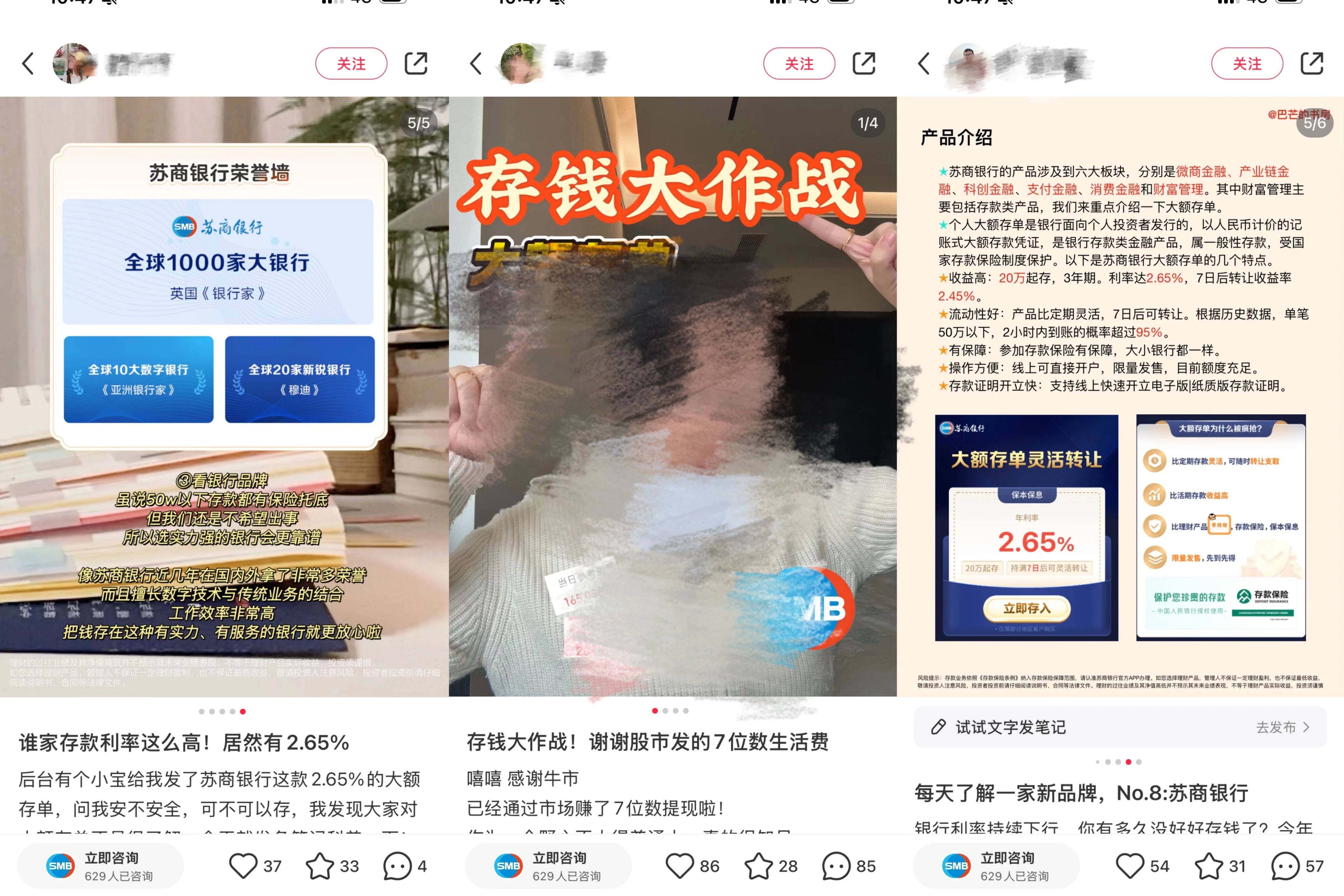 苏商银行的存款业务更加紧跟时代潮流——已经早早开始通过小红书获客,而且除了小红书的蓝V认证广告,还有通过网红大V发帖打广告。
