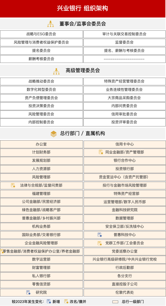 较2024年末之前比,兴业银行组织架构变动如下: