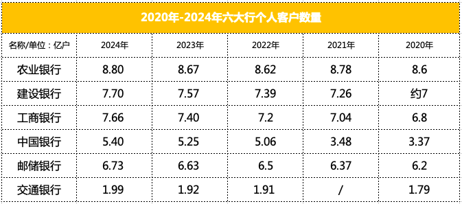2024 年,六大行在零售领域持续发力,个人客户数量稳步增长。农业银行实现 8.8 亿用户的规模,建设银行和工商银行收获7.70亿和7.66亿用户。