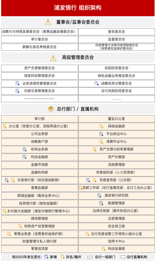 与2023年比,浦发银行组织架构变动较多,详细如下: