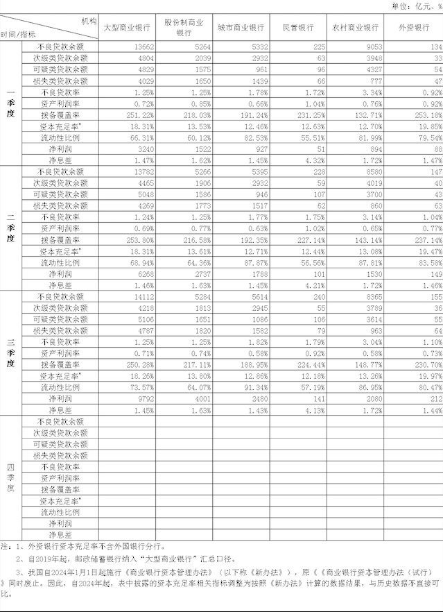行业分析 2024年三季度银行业保险业主要监管指标数据披露