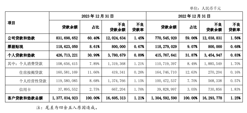 个人贷款方面,加大稳定、优质的零售中长期贷款配置,积极发展住房金融和汽车金融等,力促消费复苏与提振,持续提升零售信贷重点产品的价值创造。个人消费贷款1,086.56亿元,占比7.89%,住房按揭贷款1,605.81亿元,占比11.66%,个人经营性贷款1,195.80亿元,占比8.68%,信用卡余额378.96亿元,占比2.75%。