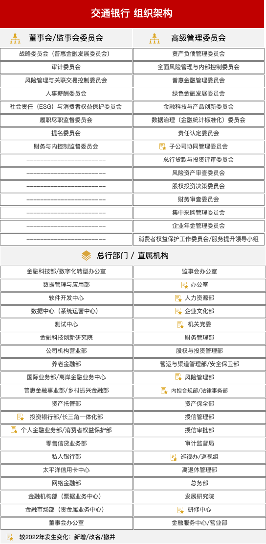 与2022年披露的信息相比,交通银行组织架构调整如下