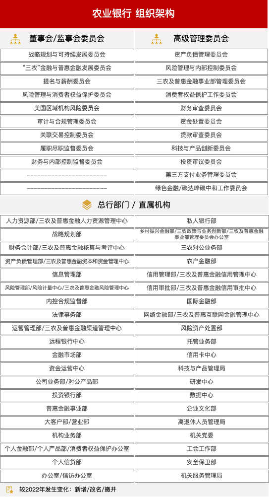 2023年,农业银行组织架构图如下,与2022年披露的信息相比,农业银行组织架构无变化。