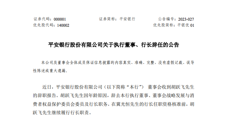 昨晚,平安银行发布公告称,近日收到胡跃飞先生的辞职报告。胡跃飞先生因年龄原因,辞去该行执行董事、董事会战略发展与消费者权益保护委员会委员及行长职务。