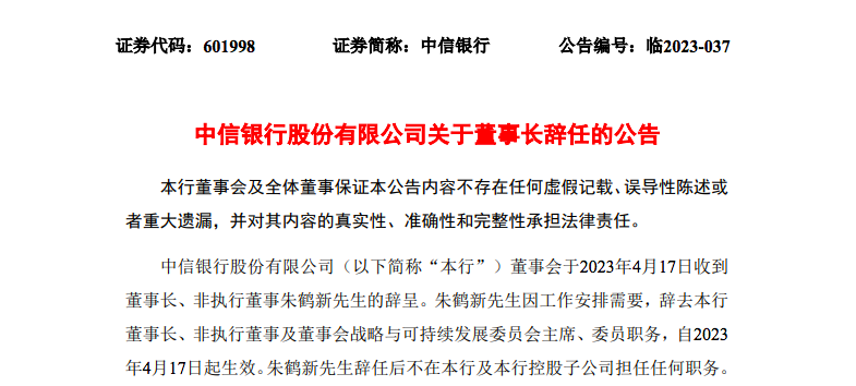 公告称,朱鹤新先生的辞任自2023 年4月17日起生效。朱鹤新先生辞任后不在中信银行及该行控股子公司担任任何职务。