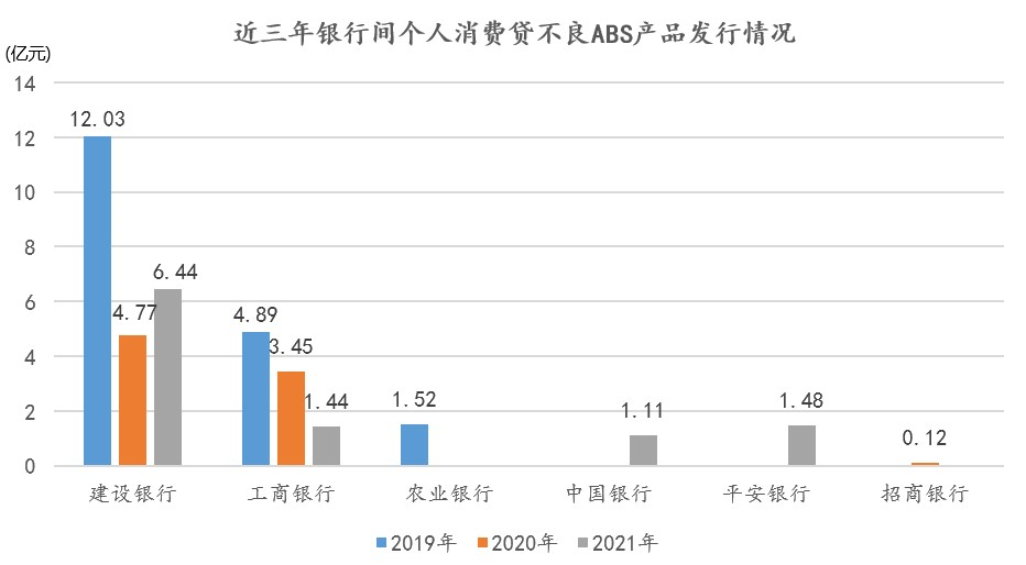 2021年,建行、工行、中行、平安共4家银行发行6单以个人消费贷为基础资产的不良资产证券化ABS产品,发行金额共计10.47亿元,涉及不良资产总额64.3亿元。自2016年不良资产证券化试点重启以来,仅建行和工行发行过以个人消费贷为基础资产的不良ABS产品,中行、招行、平安也在近两年开始尝试,可能与银行自身细分产品规模和历史回收数据积累丰富程度有关。