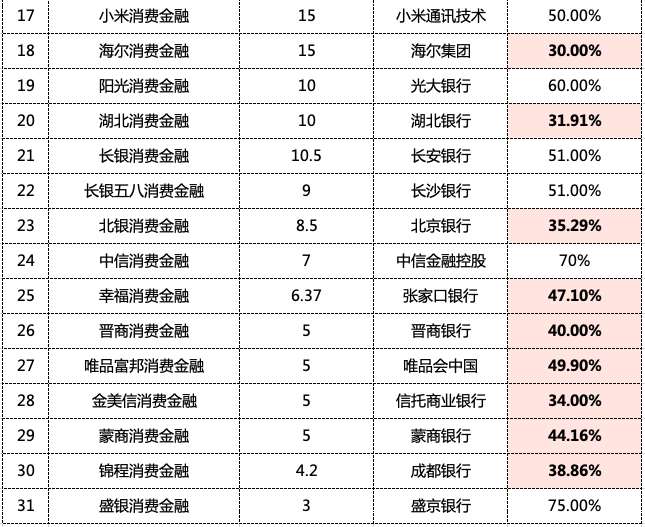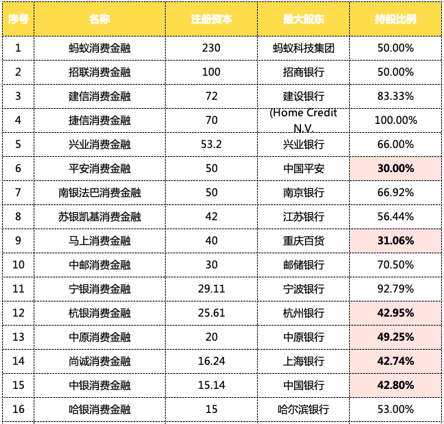 截至目前有15家消金机构的第一大股东持股比例在50%以下,包括: