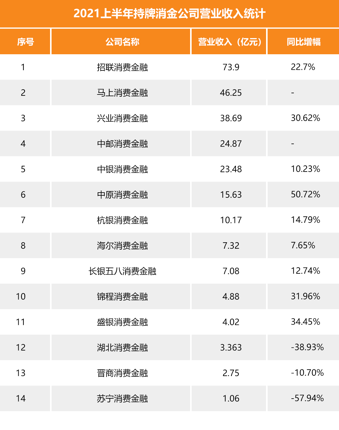 从营业收入来看,共有14家持牌消金公司披露了2021年上半年营收情况。招联消金以73.9亿元位居榜首,其次为马上消金和兴业消金。共有7家持牌消金公司营业收入超过10亿元。相较于2020年上半年,有3家消金公司营业收入同比出现负增长,分别是湖北消金、晋商消金和苏宁消金。
