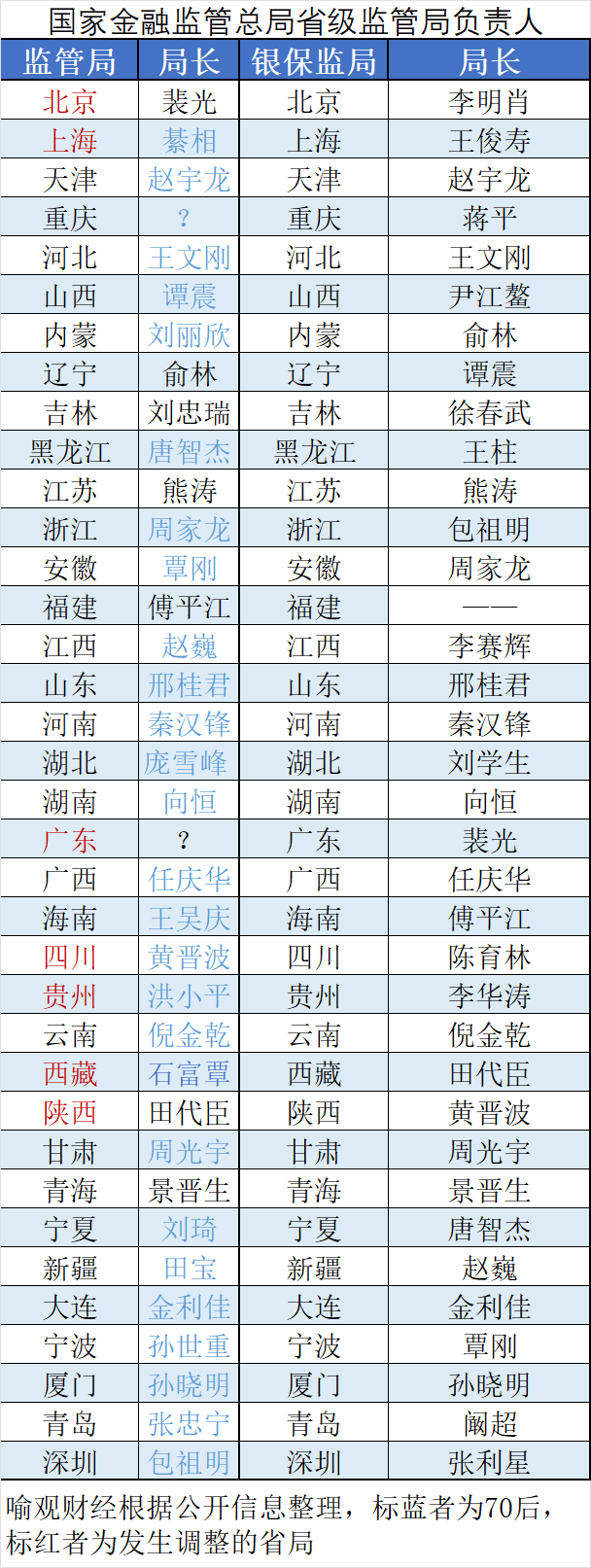 7月,金监总局36家省(自治区、直辖市)局的“三定”方案落定,省局一把手的调整仍在继续。