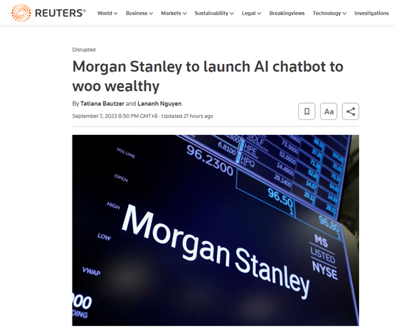 9月8日,路透社消息,全球最大金融机构之一摩根士丹利,将在本月正式发布一款生成式AI产品用于金融服务。例如,查询专业金融数据,总结金融顾问与客户的对话内容,起草电子邮件等。