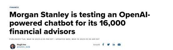 早在今年3月14日,CNBC(全球最大金融媒体之一)就发文爆料,摩根士丹利正在内部测试一款由OpenAI提供的生成式AI机器人,并希望为其16,000名金融顾问提供服务。