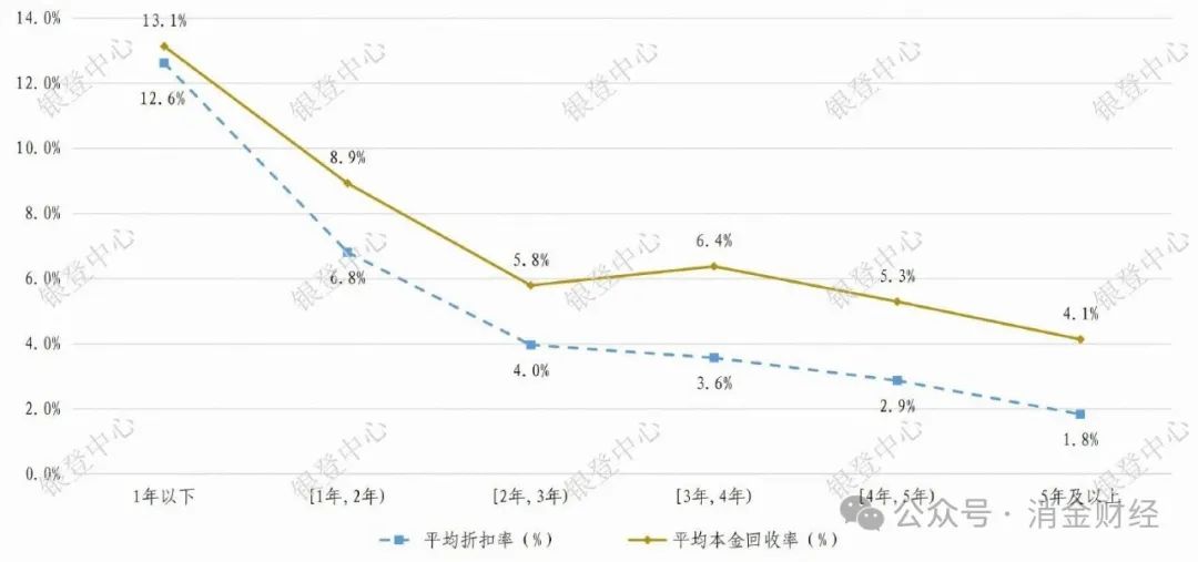 银登中心:批量个人业务平均折扣率及平均本金回收率(按逾期时间)(2025年一季度)
