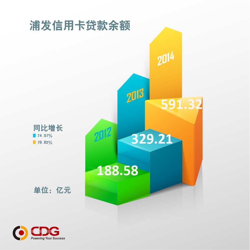 信贷额度上,截至2014年末,浦发银行信用卡贷款余额有较大幅度的增长(见图二),在整个信贷额度上的占比从8.35%提升至12.72%。